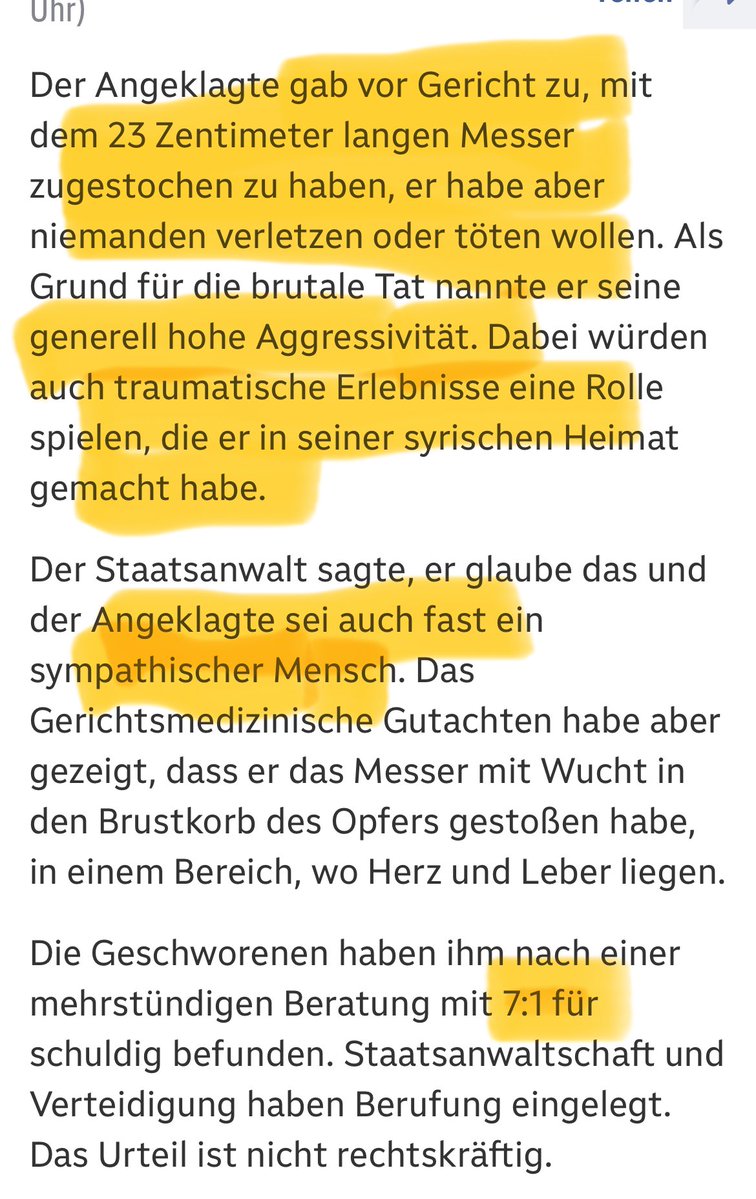 Syrer rammt Messer in Brustkorb eines Discobesuchers, wollte aber niemanden verletzen. Als Grund nennt er generell hohe Aggressivität und Erlebnisse in syrischer Heimat. Staatsanwalt glaubt er sei fast ein sympathischer Mensch. Ein Geschworener hält ihn für unschuldig. 🤡